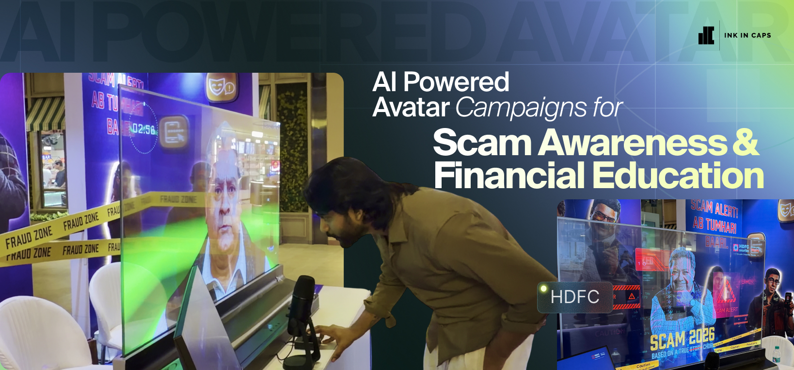 Ink In Caps built a multilingual digital avatar for HDFC Bank's scam prevention initiative. The deployment spanned 200+ branches across India. Users engaged in real-time conversations about fraud risks. Results delivered measurable impact on financial literacy and brand trust.