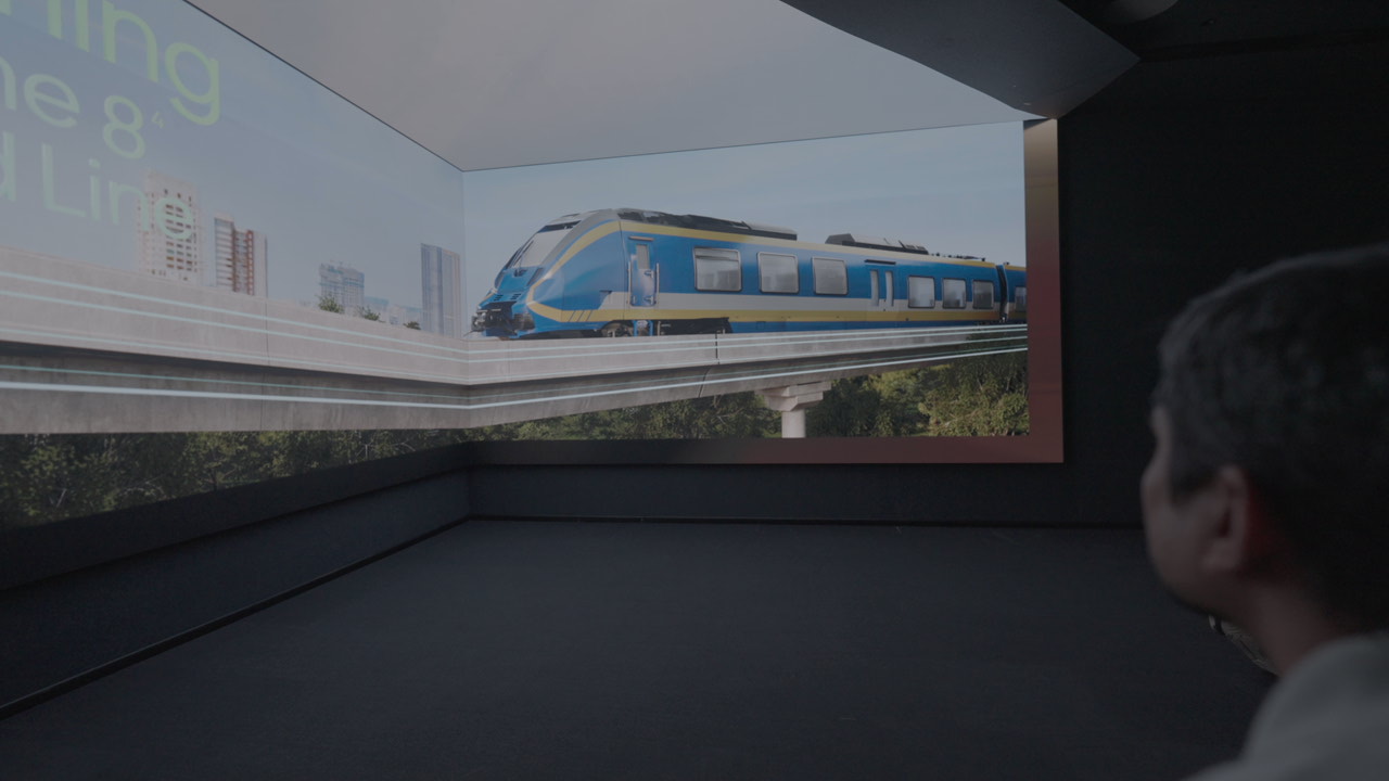 In the amphitheater, key elements of the 145-acre project literally "pop out" at the audience. Imagine a beautifully rendered 3D model of a 9-hole golf course emerging from the screen, allowing you to appreciate its scale and layout. Or picture the upcoming metro train appearing to glide right through the room.
