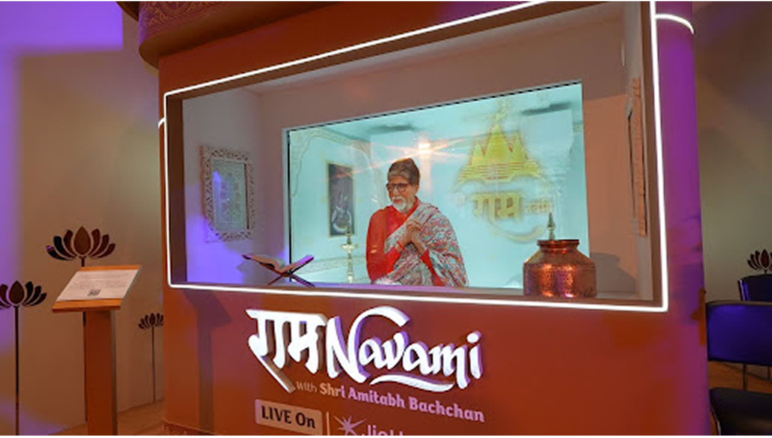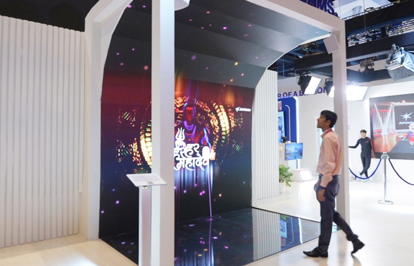 The kinetic LED wall at the Jio Pavilion demonstrated how motion — not just imagery — can convey scale and structure. Independently moving LED tiles created a sense of constellation and hierarchy, communicating the reach and plurality of a media network in a single visual gesture. Similarly, the bespoke C-shaped LED wall framed cultural content (a Mahashivratri sequence) using physical form to heighten context. These are examples of using hardware motion as a narrative instrument, not as a gimmick.